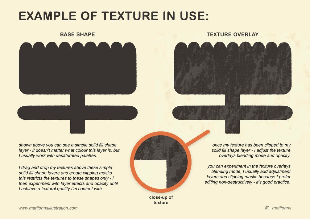 • can be used simply or complexly - overlay a flat illustration to add in subtle texture prior to printing/posting or use different textures clipped to specific layers for contrast.