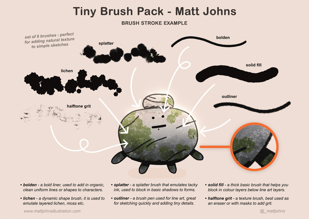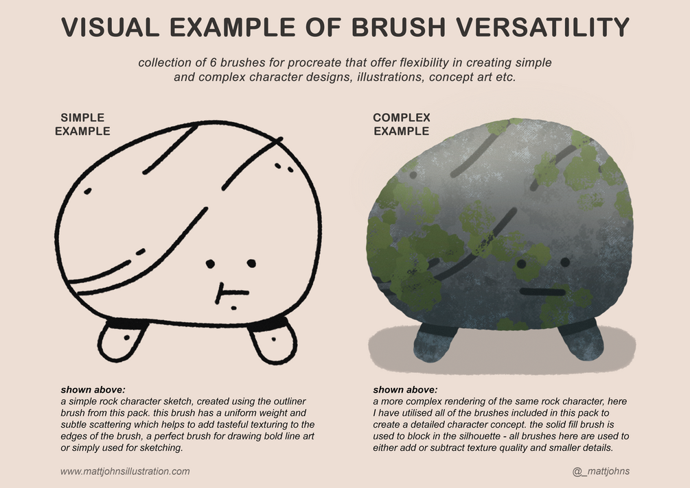 Working as a concept artist in video games, I have found creating custom brushes has allowed me to quickly add textural quality and detail without having to rely on searching for that one right brush, so I’ve spent time making brushes that are easy to use that feel diverse that you’ll find something in this pack that you’ll love using regularly too! taking the time to learn how to make my own tools such as these brushes has aided towards drawing certain styles easier while also ideating faster + develop more visually interesting character and environments for professional works.